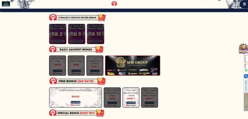 - Free 365 Random Bonus: Enjoy a daily bonus (free credit 365 hari) of RM10 to RM30, decided at random. Withdrawals are limited to RM12 once you’ve won a minimum of RM600 from certain slot providers.